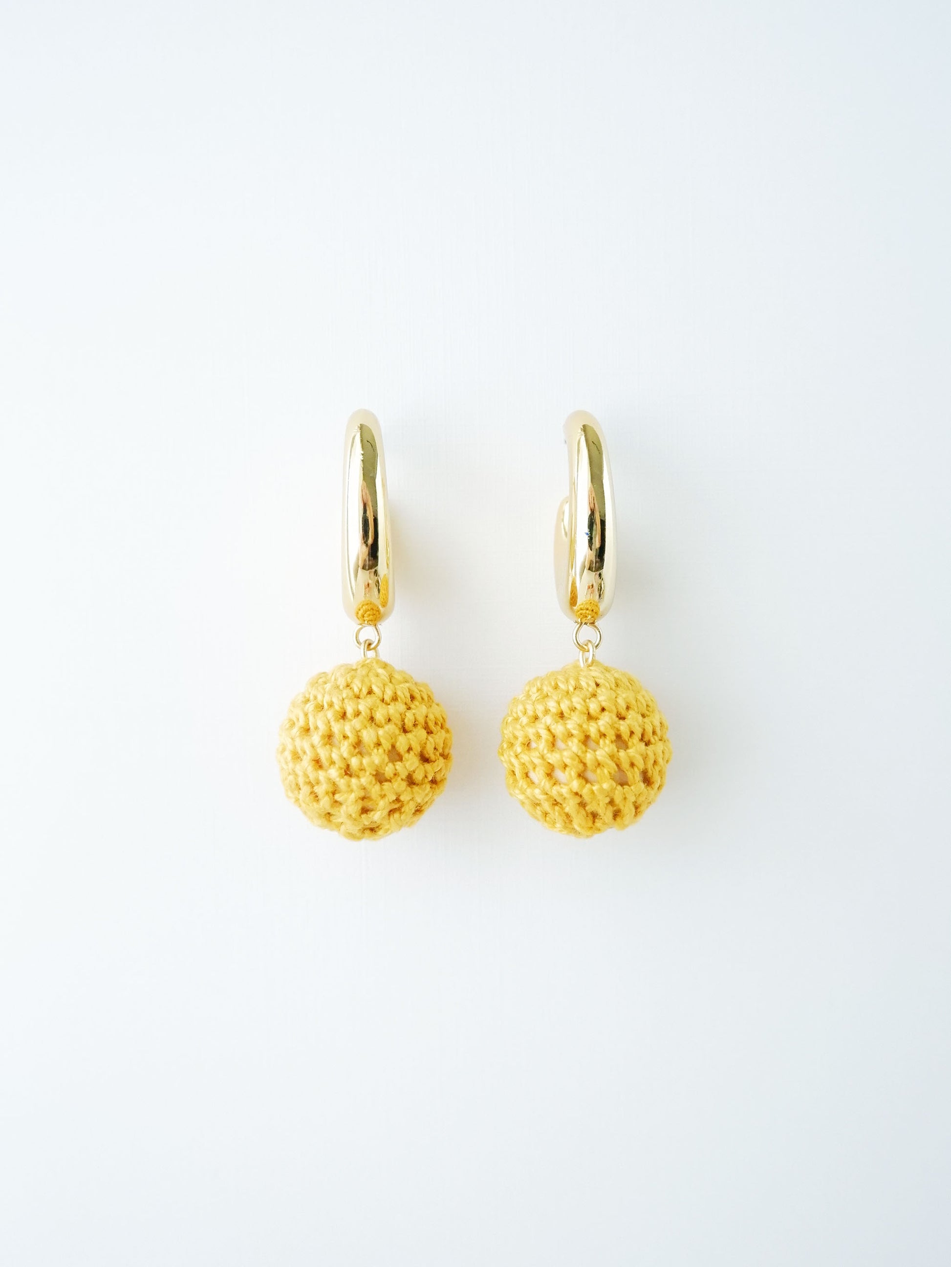 Measurements: gold earring measures 23mm x 5.5mm, crochet bead measures approx. 18mm in diameter; entire earring measures approx. 45mm x 18mm