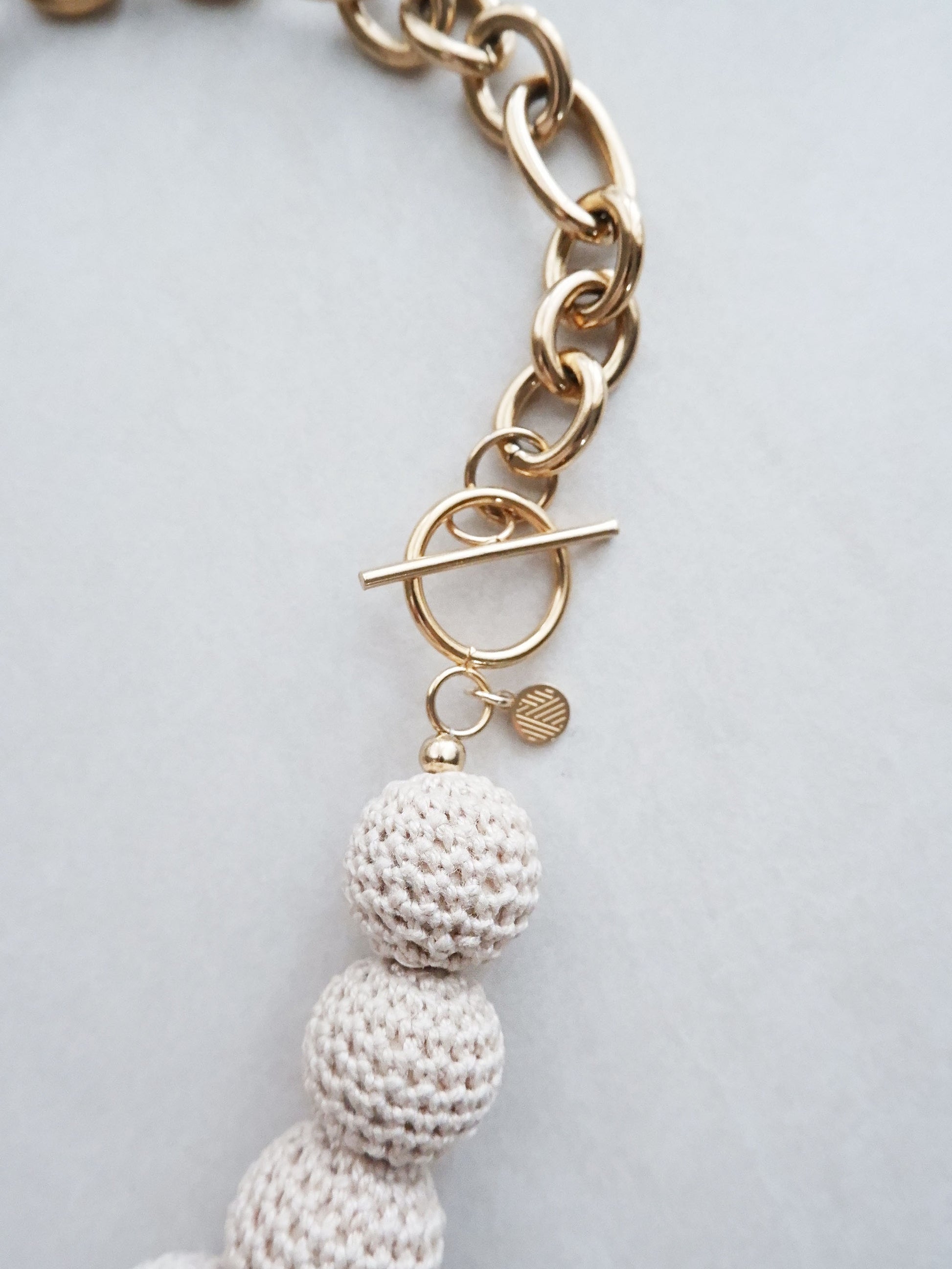 Materials: cotton crochet thread, wood beads, gold-plated stainless steel toggle clasp and chain